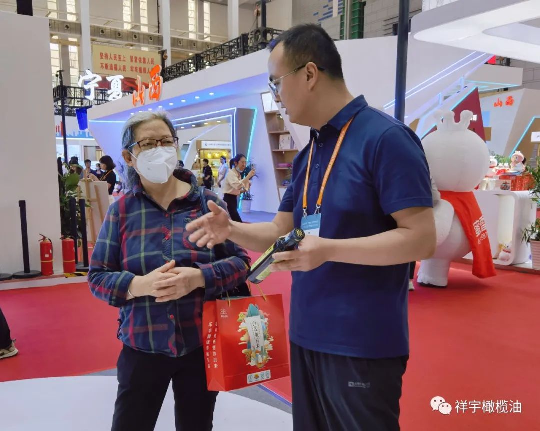 展會(huì)現(xiàn)場(chǎng),來(lái)賓、客商紛紛到祥宇橄欖油展臺(tái)前駐足品鑒,